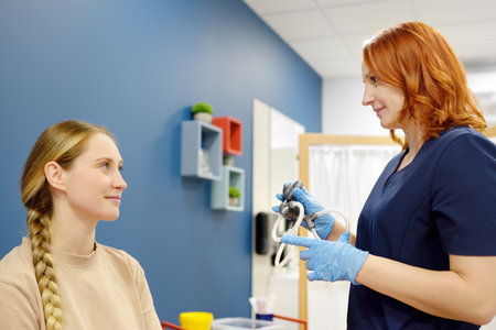 Portrait of mid adult doctor with otoscope examining patient's ear in hospital