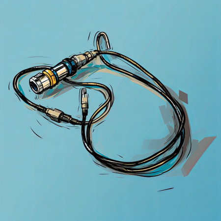 A retro audio cable with various connectors is isolated on a blue background, blending modern technology with vintage equipment for audio, music, and electronics concepts.