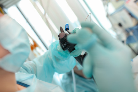Procedure of endoscopy in the ICU assisted by a team of doctors, unfocused background.