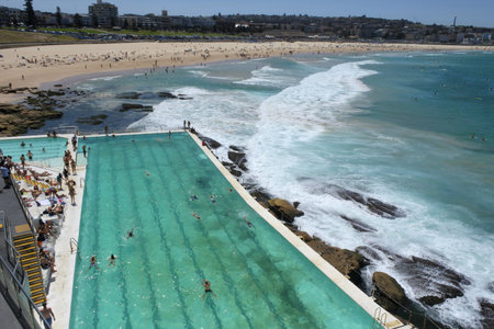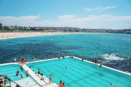 SYDNEY, AUSTRALIA - January 22, 2019: People relaxing on the swimming pool on a beautiful day, Bondi Beach is a famous place in Sydney