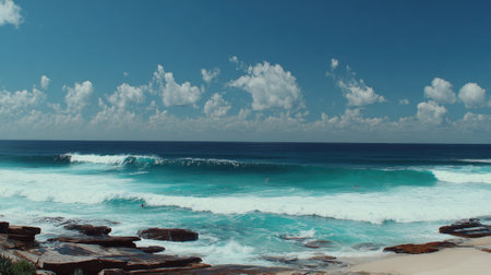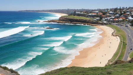 Immerse yourself in the captivating allure of Sydney with this stunning image that blends the vibrancy of Bondi Beach's pristine shores with the mesmerizing skyline of the bustling cityscape. Watch as iconic surfers catch epic waves against the backdrop of modern architectural wonders and historic landmarks, forming a breathtaking urban panorama that symbolizes the irresistible beauty and limitless adventures that await in Sydney.