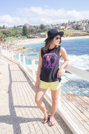 Young woman with hat and sunglasses walking by the public swimming pool at Bronte beach in Sydney Australia