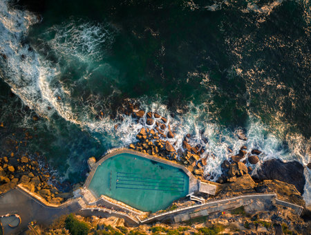Generative AI : Aerial view of a person swimming at Bronte Baths an oceanside saltwater pool Sydney New South Wales Australia