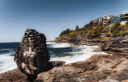 The rocky shoreline around Bondi beach, Sydney, Australia. Waves splashing at the rocks in the water. Tamarama point with view to Tamarama beach. White clouds on blue sky. Autumn at New South Wales