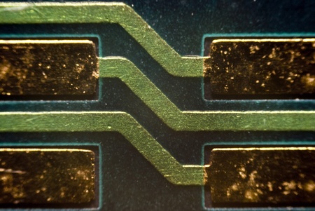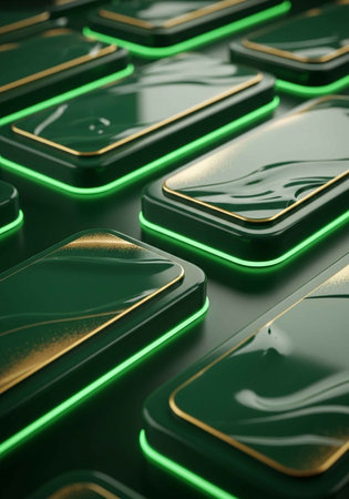 A close-up view of a sleek and modern array of green and gold electronic devices with neon lights