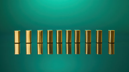 A striking arrangement of gold rectangular bars stands in a perfect row on a reflective surface, set against a smooth turquoise backdrop, highlighting elegance and simplicity.