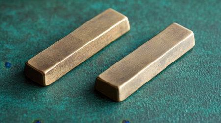 Two sleek metallic bars resting on a textured green surface, showcasing intricate details and a modern aesthetic, perfect for design projects and art concepts.