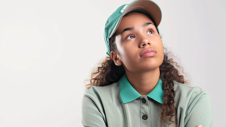 Young female courier reflecting on an idea, staring up with serious expression on white