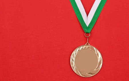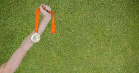 Composition of caucasian female athlete holding gold medal with copy space on grass background. sport, winning and competition concept digitally generated image.