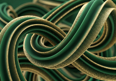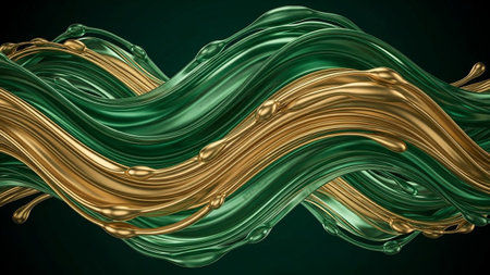 An abstract visual featuring intersecting fluid ribbons of emerald green and gold, characterized by their glossy texture and subtle droplet accents. The smooth, flowing lines create a sense of motion and depth. The metallic sheen of the gold and the rich hue of the green are amplified by the dark background, enhancing the and aesthetic. This evokes a feeling of dynamic fluidity and artistic craftsmanship.