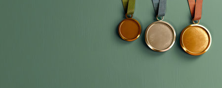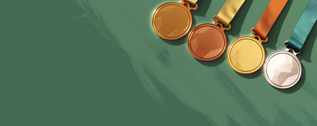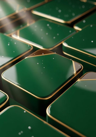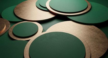 A close-up view of a collection of green and gold circular shapes with metallic borders