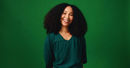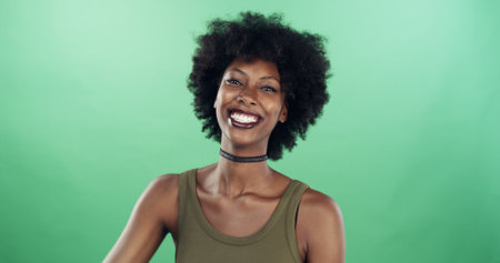 Afro, portrait and smile with black woman in studio for creative career as fashion designer. Design, excited and friendly with happy African stylist on green background for small business startup