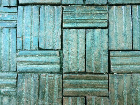 A close-up view of green hexagonal tiles with gold trim on a matching green surface