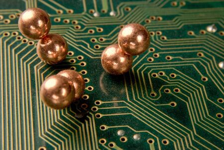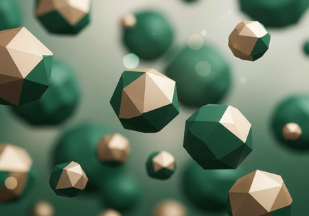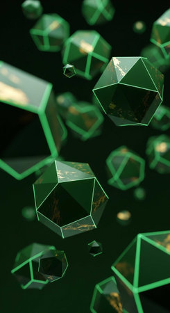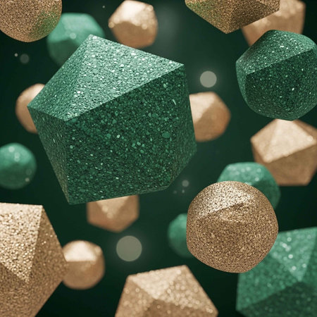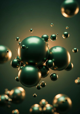 A cluster of shiny green and gold metallic spheres floating in mid-air against a dark background