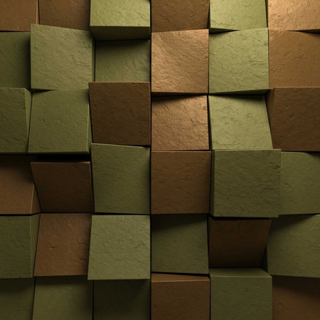 A close-up view of a modern textured wall composed of various sized cubes in earthy tones