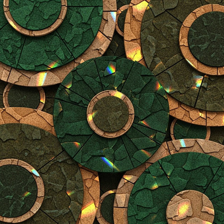 A close-up view of broken green and gold CDs with a mosaic-like pattern