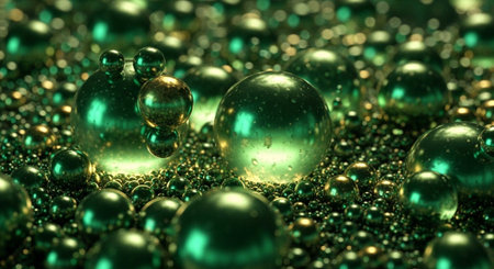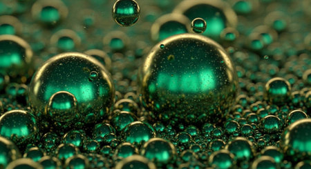 A close-up view of numerous green and gold bubbles of various sizes on a reflective surface