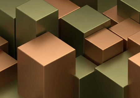 A close-up view of a collection of metallic cubes in various shades of green and brown