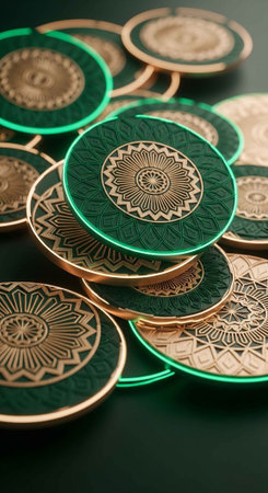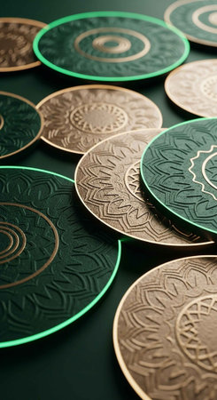 A collection of green and gold decorative coins with intricate designs on a dark surface