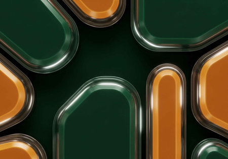 A modern abstract design featuring green and orange rounded shapes on a dark background