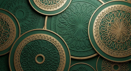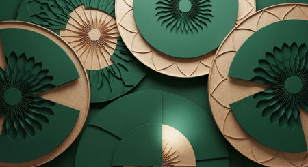A close-up view of intricately designed green and gold paper cutouts arranged in a visually appealing pattern