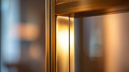 This image captures the intricate details of a gold metallic surface reflecting soft light, ideal for showcasing modern interior design elements.