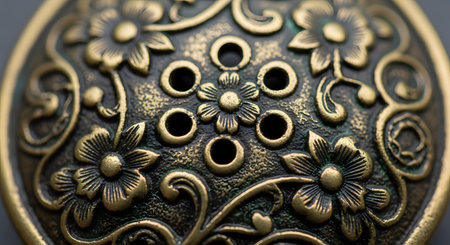 An extreme macro close-up of a vintage-style brass kenzan, or flower frog, used for Japanese ikebana. The metal object has an ornate, embossed floral pattern and holes for holding flower stems.