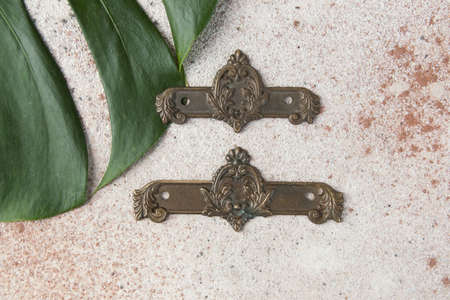 Antique bronze furniture hardware on concrete background. Copy space for text.