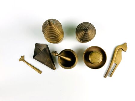 Top view ancient brass set of thai betel-contained tray, isolated on white background