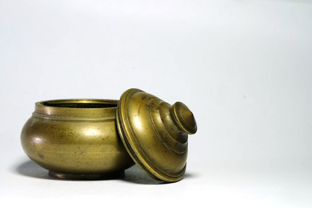 Isolate photo of ancient small brass circular box with screw cap with space for write wording, value container usually use in old generation to store lip grease or tradition lip balm.