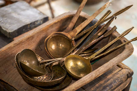 Vintage copper kitchenware and accessories - forks, spoons, rings, bracelets in flea market