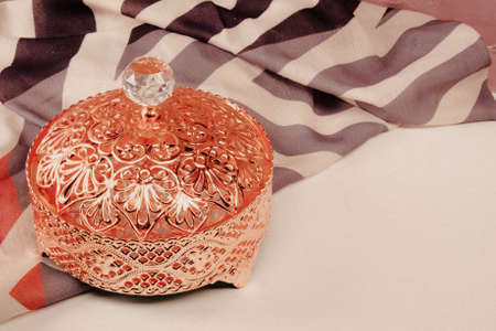 Vintage brass perfume bottle with bokeh background, close up
