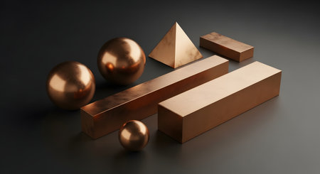 A still life arrangement of various polished copper geometric shapes, including spheres, rectangular prisms, and a pyramid, on a dark background.