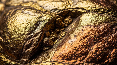 An extreme close-up reveals the intricate and textured surface of a that appears to be molten gold or a richly colored metallic ore. The surface is a complex landscape of peaks, valleys, and crevices, with a shiny, reflective that catches the light. Shades of deep gold, bronze, and copper create a warm and opulent visual, highlighting the detailed and irregular patterns.