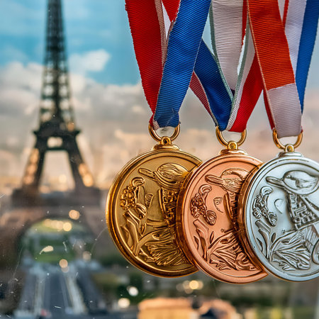 Paris olympics games France 2024 ceremony medal running sports Eiffel tower summer artwork , generated by AI. High quality photo