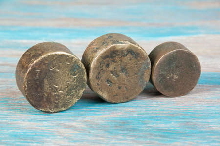 Three antique bronze weights for scales on blue wooden background. Copy space for text and food photography props.