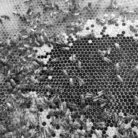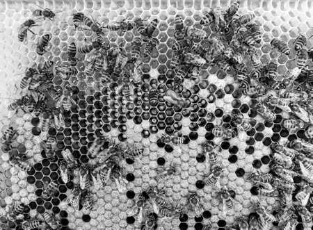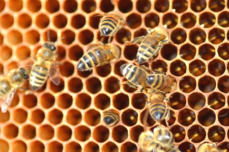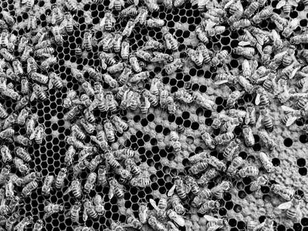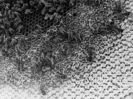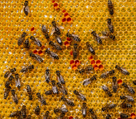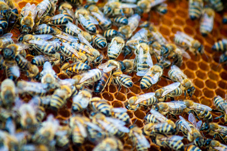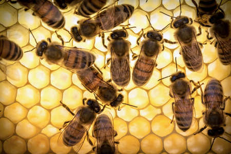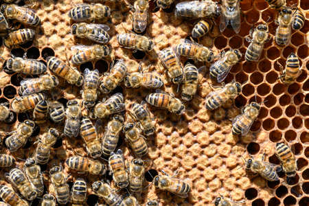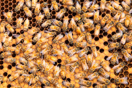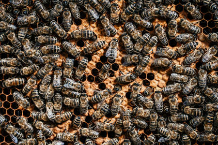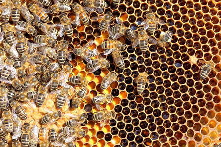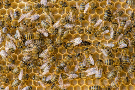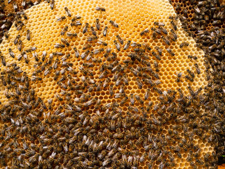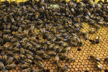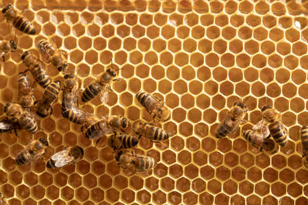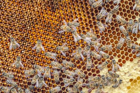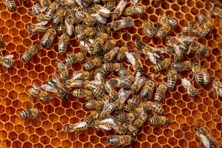 Close up view of the working bees on honeycells. Beekeeping concept.