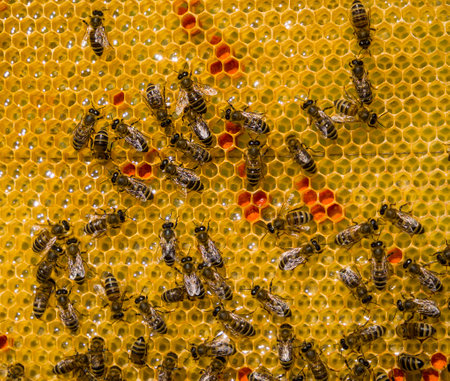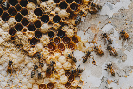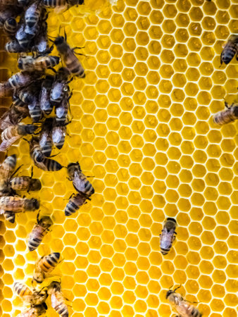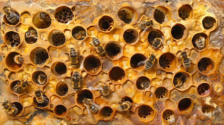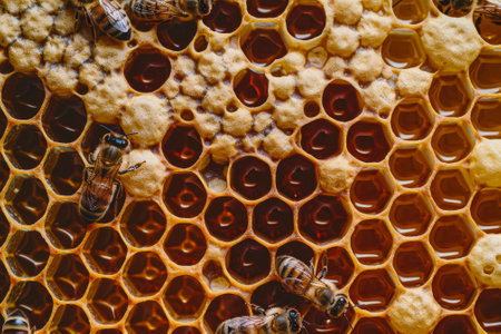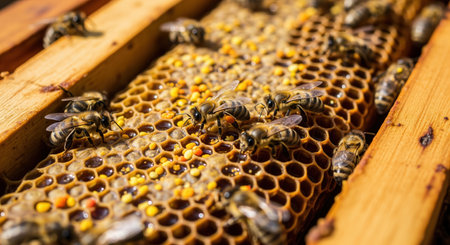 Honeybees diligently working on a hexagonal beeswax honeycomb. cells are filled with golden honey and colorful pollen granules, showcasing the intricate structure of a beehive.