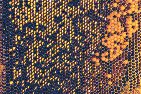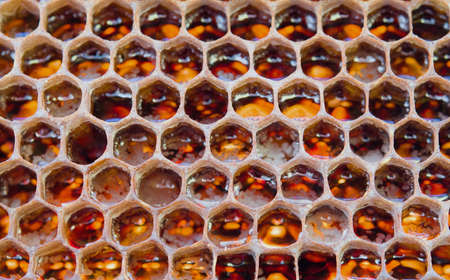 Abstract hexagon structure is honeycomb from bee hive filled with golden honey. Honeycomb summer photography consisting of gooey honey from bee village. Honey rural of bees honeycombs to countryside.