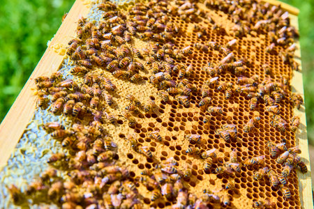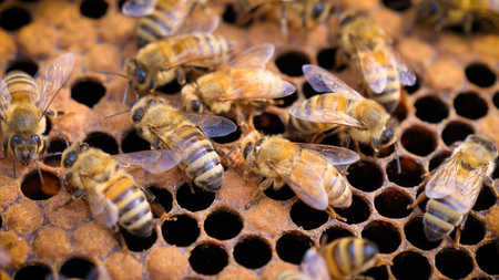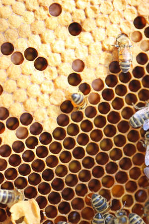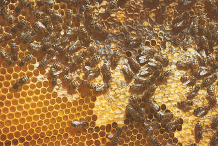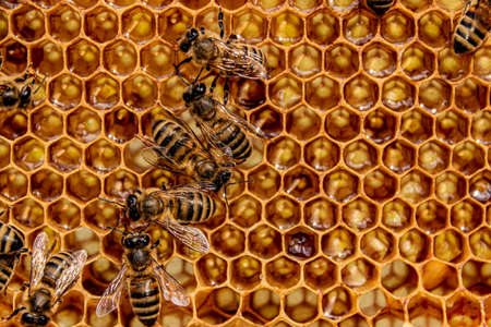 closeup of bees on honeycomb in apiary Honey bee selective focus