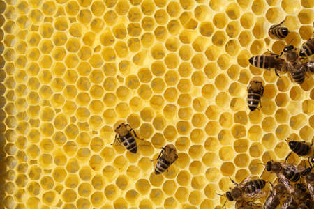 Close up view of the working bees on the honeycomb. Bee honey collected in the beautiful yellow honeycomb just taken from beehive.