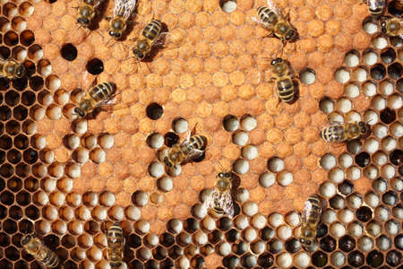 Bee brood on honeycombs. Hatching young bees, pupae, larvae, bee eggs.