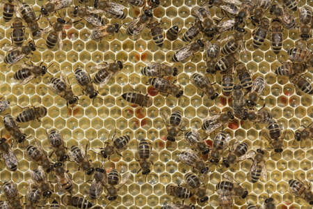 Background of bees on honeycombs with honey. Insects work on frames in the hive