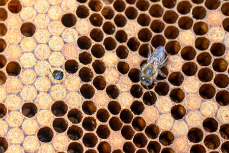 Macro photo of a bee hive on a honeycomb with copyspace. Bees produce fresh, healthy, honey.