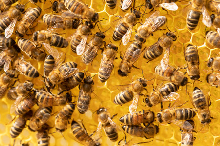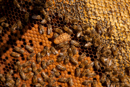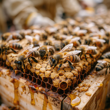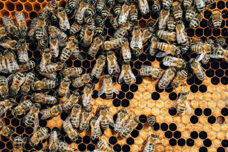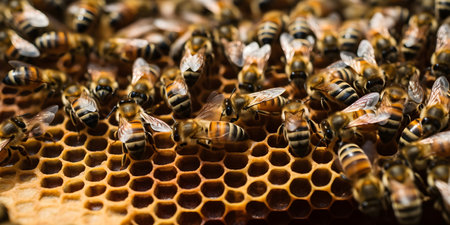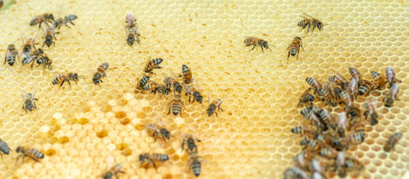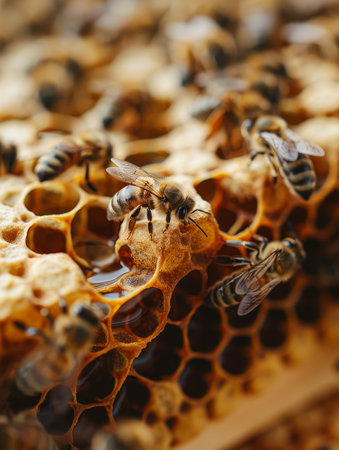 Honey bees on honeycomb in an apiary. Close-up view showing detail and texture. Apiculture and sustainable agriculture concept. Design for educational material, nature studies.