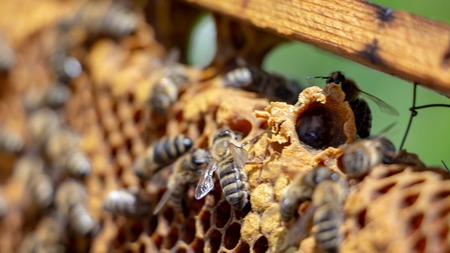 Frames of a beehive. Close up view of big cell with young bee queen. Opened hive body showing the frames populated by honey bees and yellow honeycomb with open and sealed cells for sweet honey.