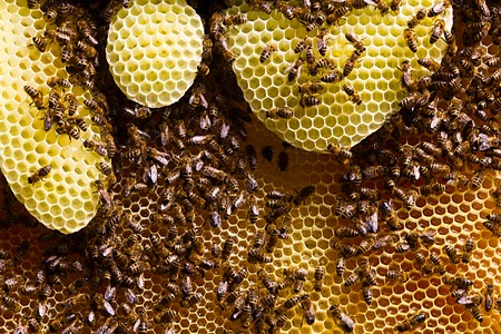Flower pollen is placed in wax combs. The pollen brought by the bees was placed in honeycombs. They will fill it with honey.