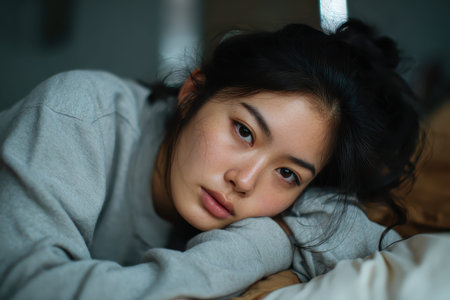 Young Asian woman experiencing boredom and insomnia while laying on a bed in a dimly lit room during late night hours