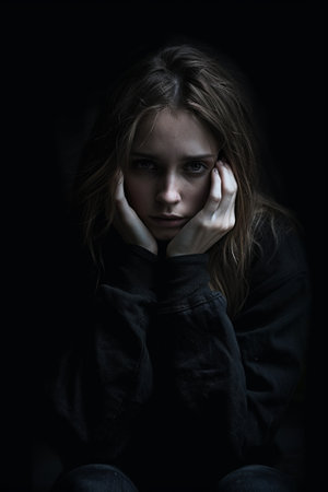 Woman Overcome with Sadness and Grief on a Dark Studio Background