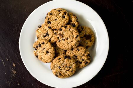 Delicious chocolate chip cookies on a white plate over bright background. Peanut butter cookies with chocolate chunks.